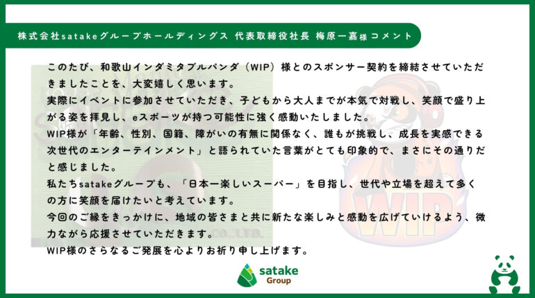 <株式会社サンレックス 代表取締役社長 𠮷村章 様 コメント>このたび、和歌山インダミタブルパンダ(WIP)とのスポンサー契約を締結できましたことを、大変嬉しく思います。eスポーツは、これからの時代を担う新たなカルチャーであり、技術・戦略・チームワークが求められる点において、我々サンレックスが日々の業務で大切にしている姿勢とも共通するものがあります。また、WIP様が地域に根ざした活動を行い、若者を中心に夢と希望を与えている姿勢に深く共感し、今回のスポンサー契約を通じて、微力ながらその挑戦を応援させていただく運びとなりました。サンレックスは、ITとデータの力で社会に新たな価値を提供する企業として、eスポーツの発展、そして地域コミュニティの活性化にも貢献してまいります。WIPの皆様の今後のご活躍を、心より応援しております。
