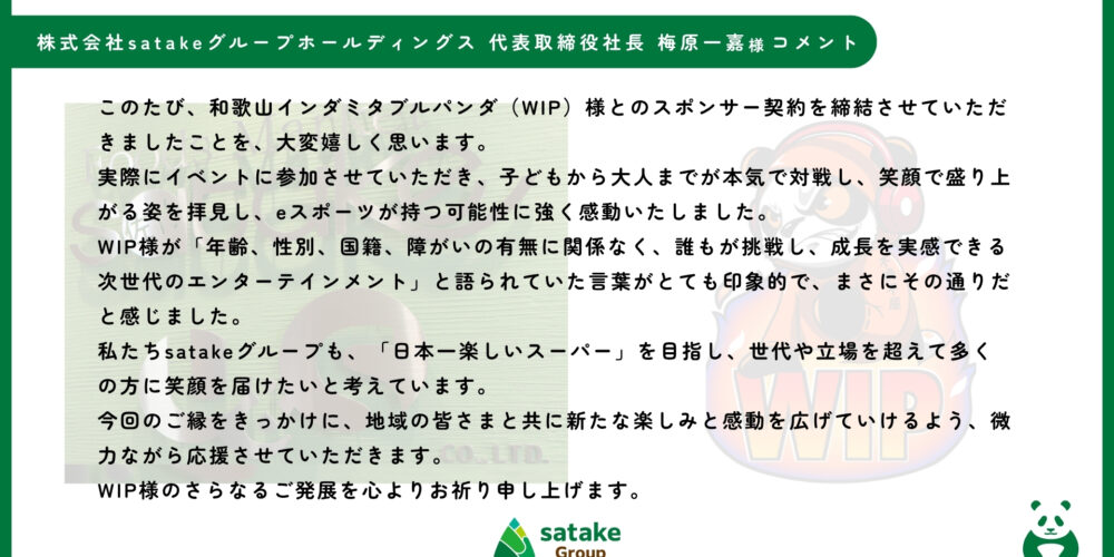 株式会社satakeグループホールディングス様と和歌山インダミタブルパンダ(WIP)のスポンサー締結に至り、チーム一同、心より感謝申し上げます。